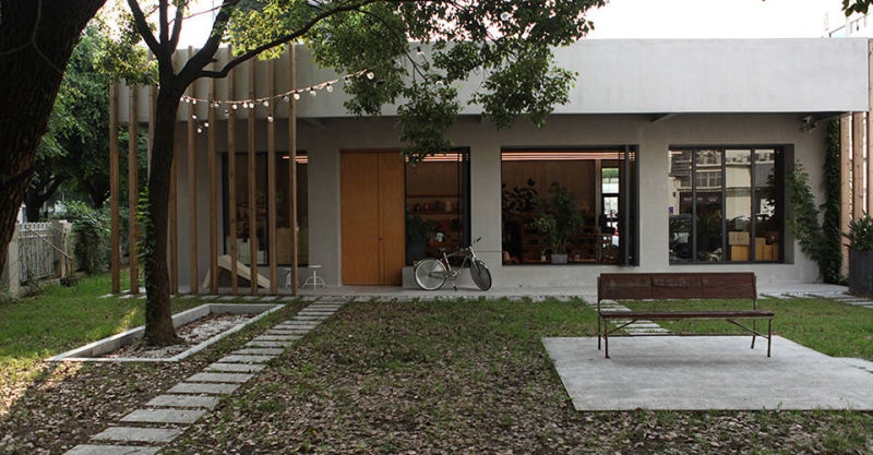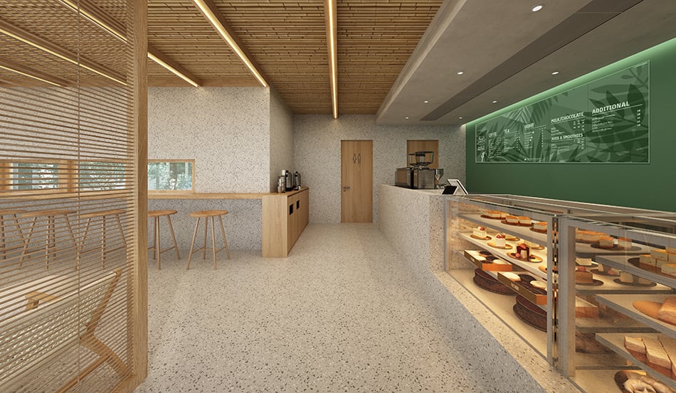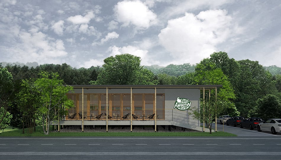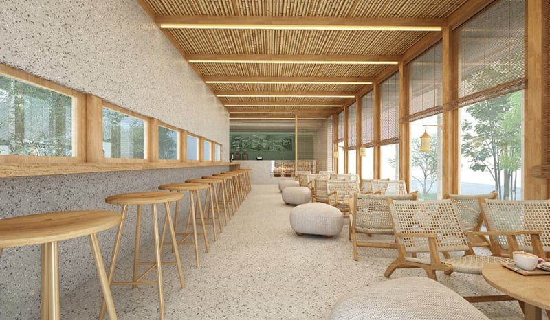 Cafe Amazon San Patong, Chiang Mai – A budget-conscious stand-alone branch built with a steel structure, featuring natural materials and a prominent bamboo slat ceiling. The design connects to both the street and a quiet rear garden.